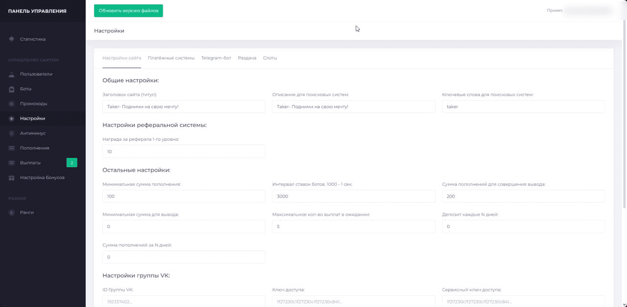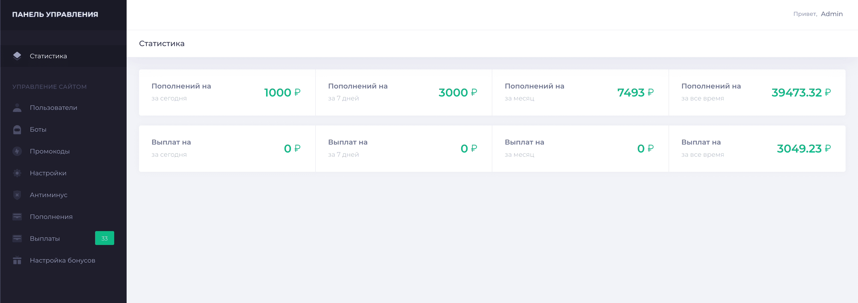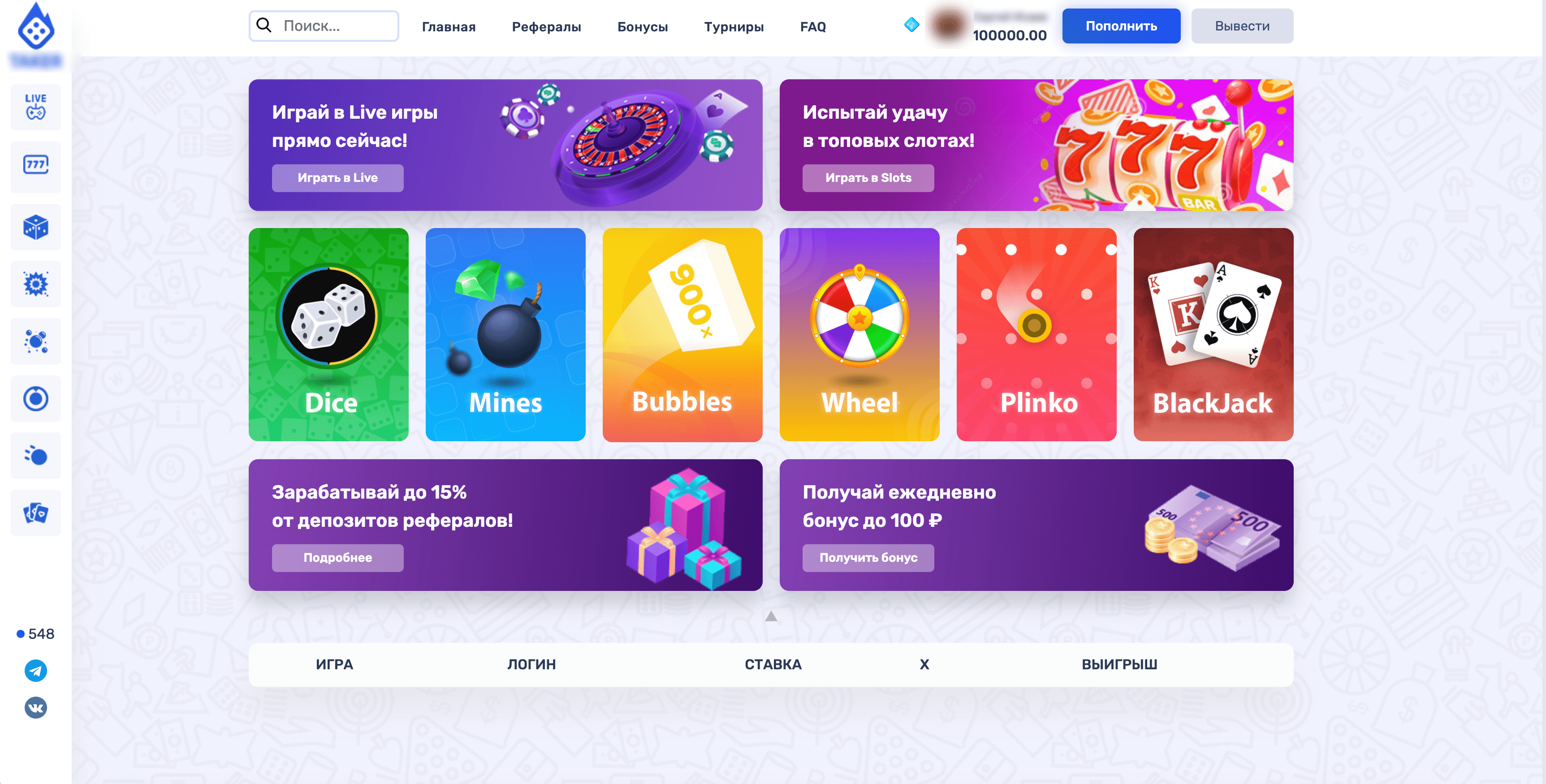 Адаптивный дизайн, 9 режимов игры: Crazy Shoot(Новинка! Вы стреляете по игровым карточкам, анимация присутствует), Dice, Mines, Slots, X100, X30, CoinFlip, Crash, Keno (онлайн режим). Умный телеграм бот. Будет оповещать игроков о бане домена, проблемах сайта, новых промокодах в вашем канале самостоятельно и статусе выводов. Бонусы за подписки в группы, каналы, за репосты и привязку к тг. Реферальная система. Больше 6 платежных систем с 50+ методами, включая крипту.