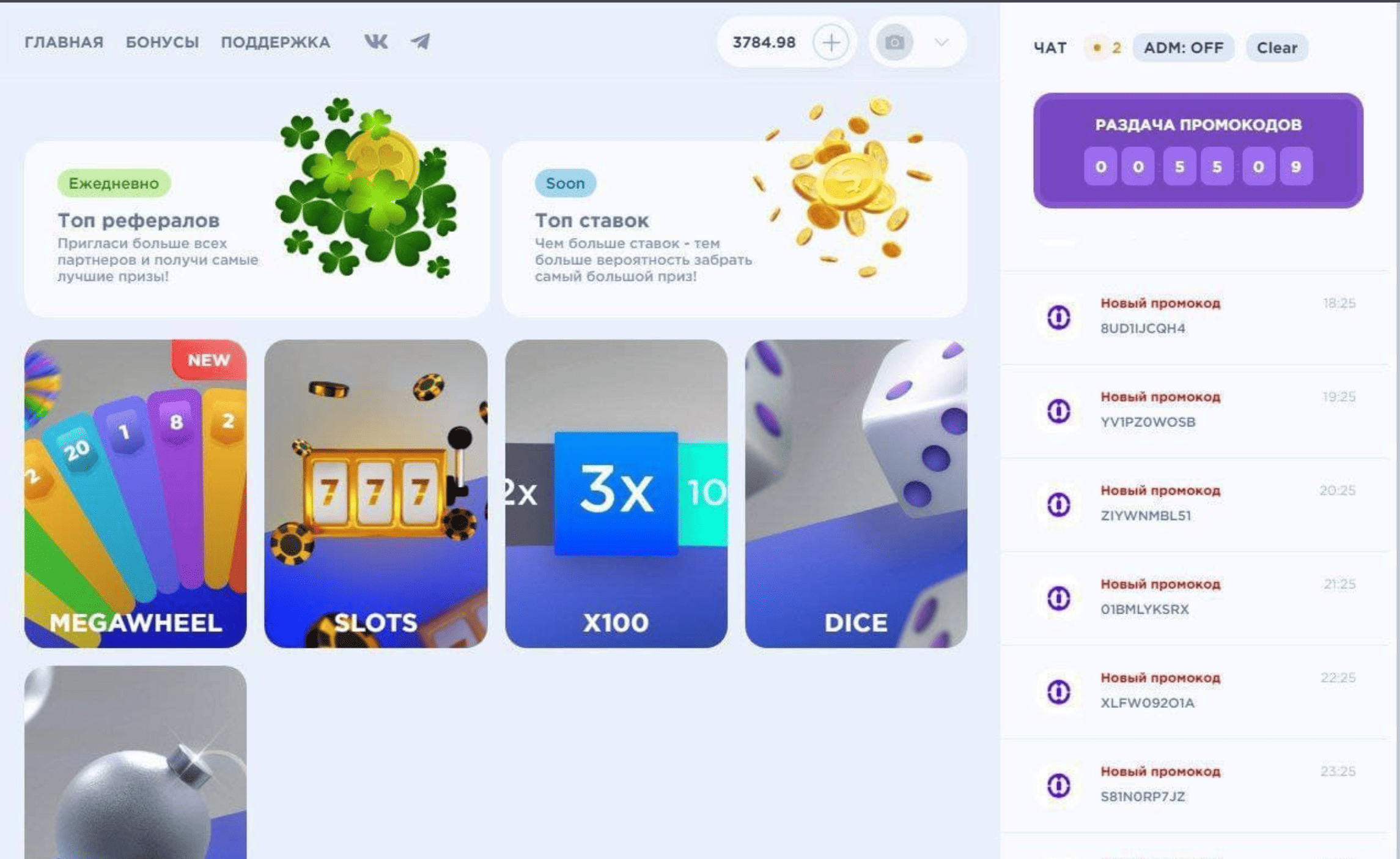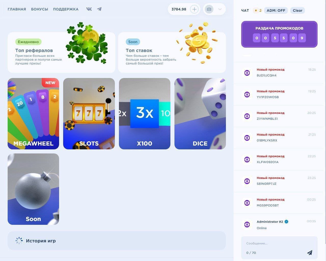 Есть чат с промокодами, роль ютубера и модератора, возможность получать уведомления к себе в лс в вк о депозитах / выводах и т.д