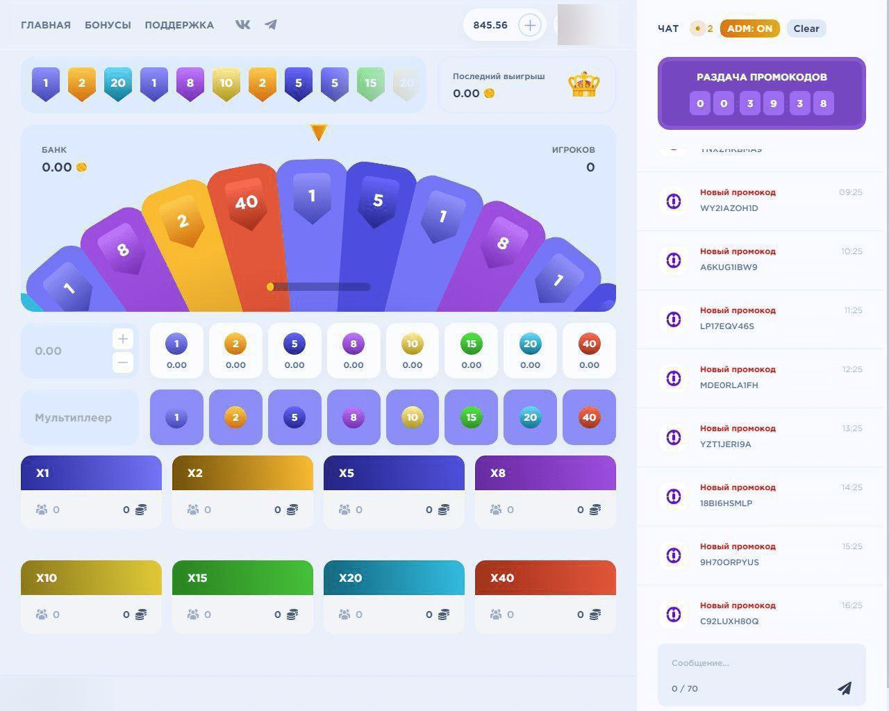 Адаптивный дизайн, 9 режимов игры: Crazy Shoot(Новинка! Вы стреляете по игровым карточкам, анимация присутствует), Dice, Mines, Slots, X100, X30, CoinFlip, Crash, Keno (онлайн режим). Умный телеграм бот. Будет оповещать игроков о бане домена, проблемах сайта, новых промокодах в вашем канале самостоятельно и статусе выводов. Бонусы за подписки в группы, каналы, за репосты и привязку к тг. Реферальная система. Больше 6 платежных систем с 50+ методами, включая крипту.